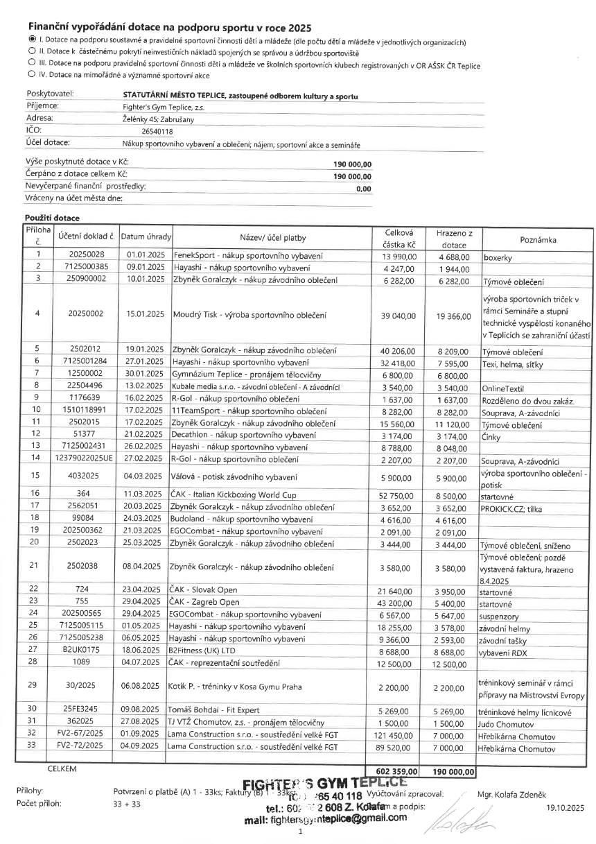 Finanční vypořádání dotace dle počtu mládeže v organizaci v jednotlivých organizacích, 2025